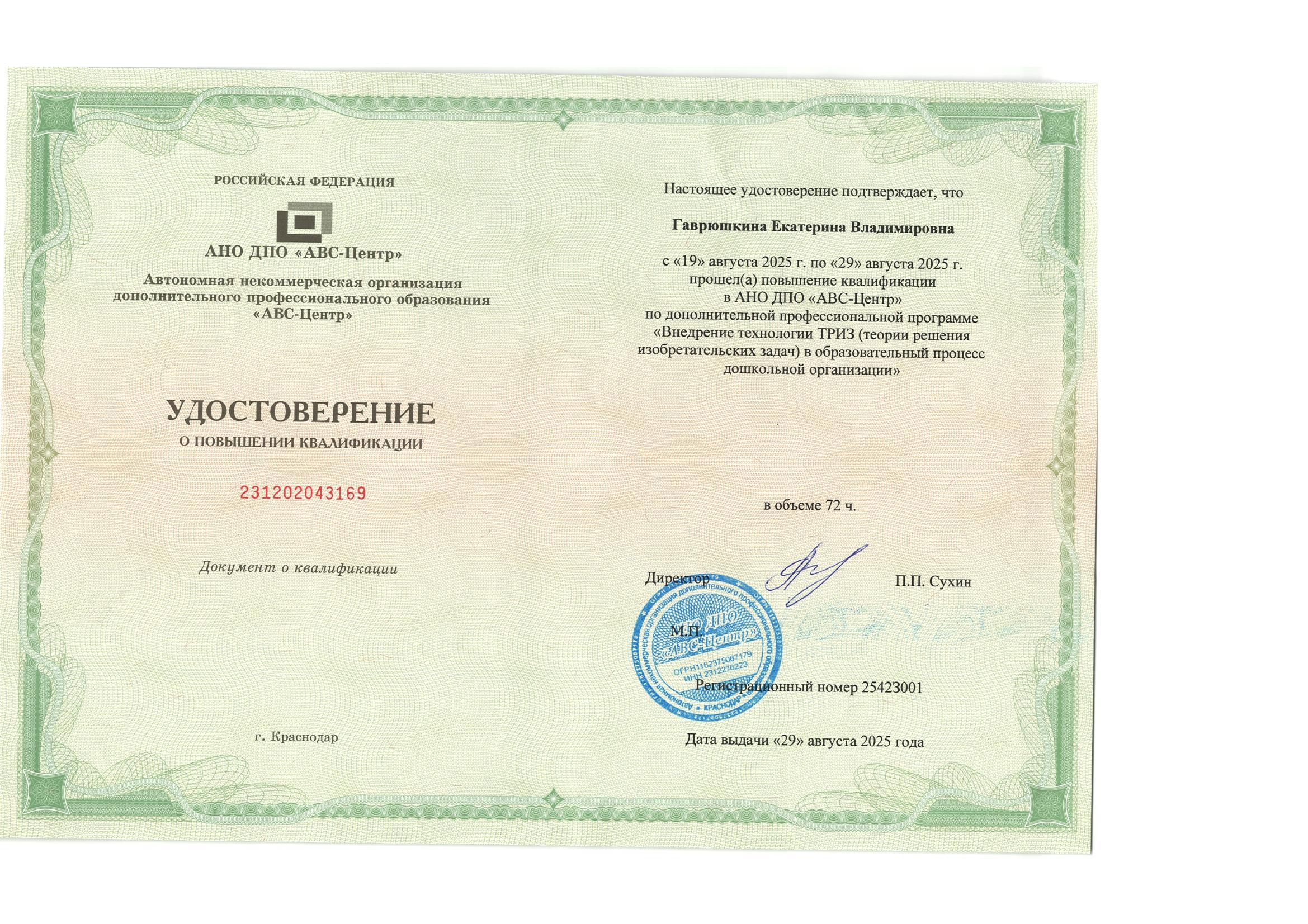 • "Реализация дошкольного образования для воспитателей в соответствии с ФГОС и ФОП", 72 часа (Институт переподготовки и повышения квалификации, 2024)